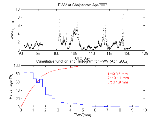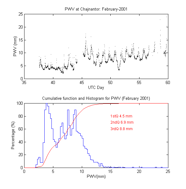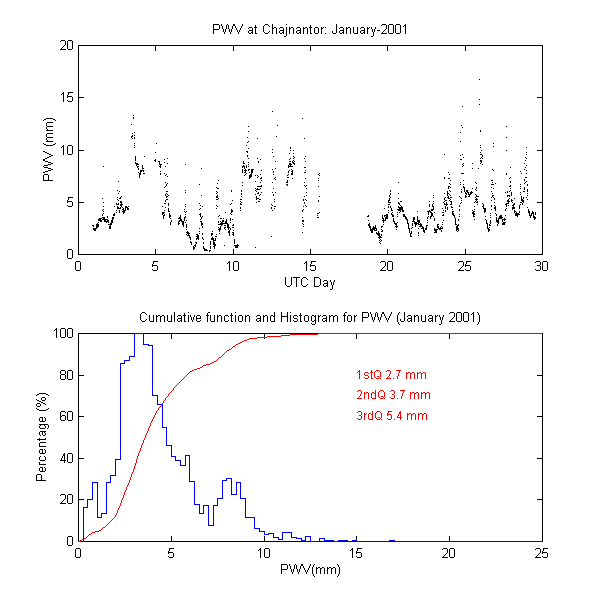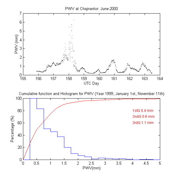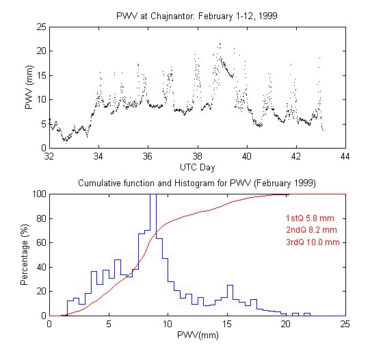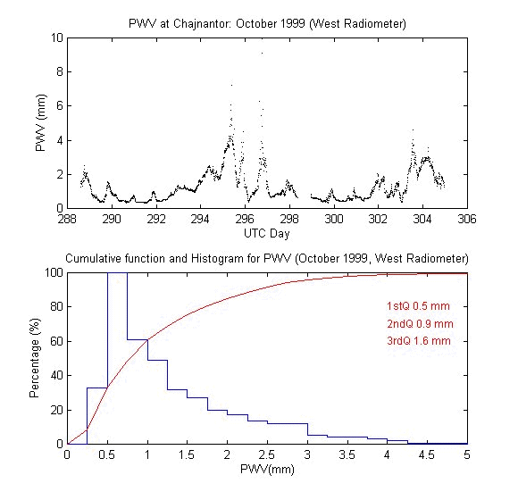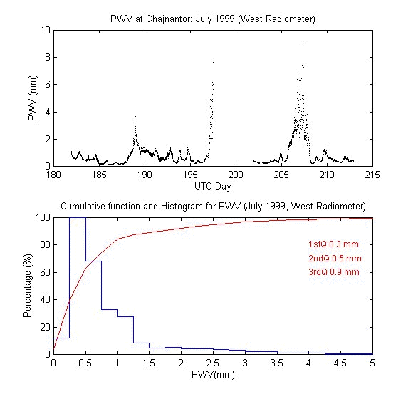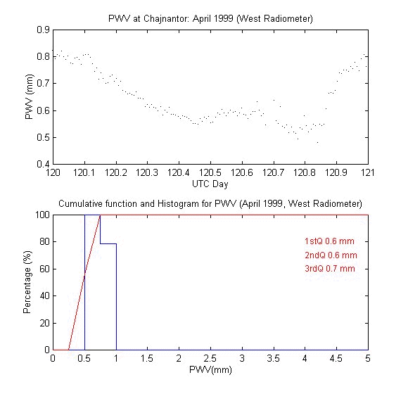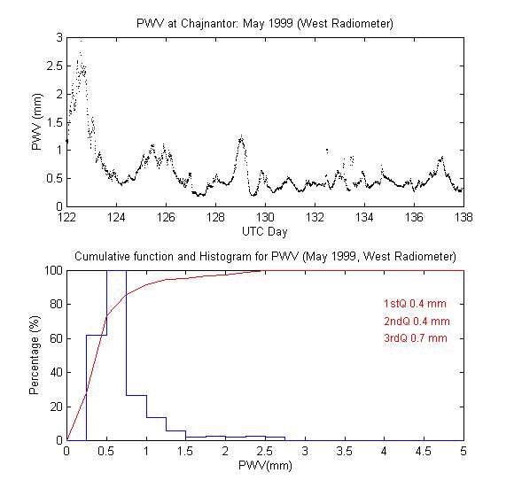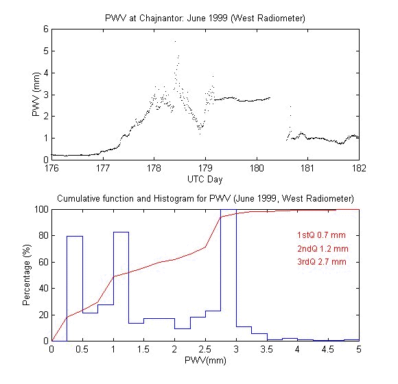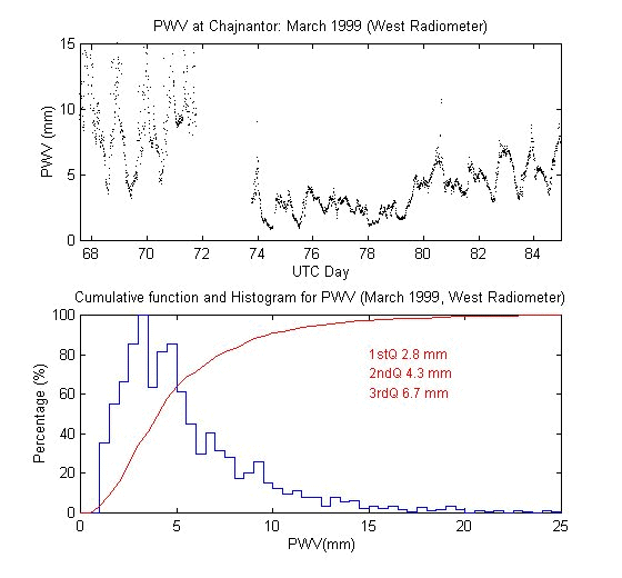 To measure the precipitable water vapour, Onsala Space Observatory and the The Cavendish Astrophysics Group at the University of Cambridge had designed and built two 183 GHz radiometers . These radiometers measure the brightness temperature in three bands close to the 183 GHz water line. These bands are: 1.2 GHz, 4.1 GHz and 7.6 GHz away from the water line centre. During data reduction we iterate on the water vapour density in the radiative transfer equation to obtain the amount of precipitable water vapour producing the sky brightness temperature measured by the 183 GHz radiometer.