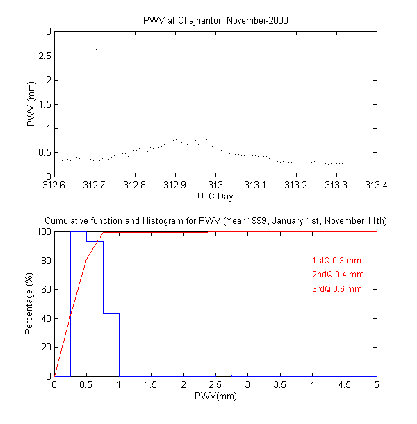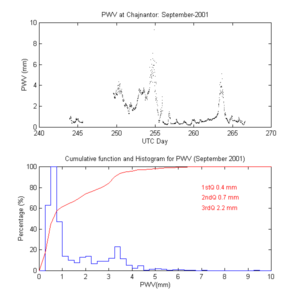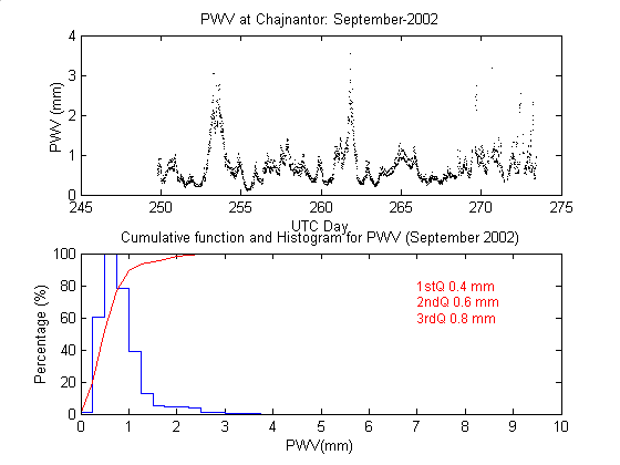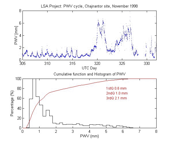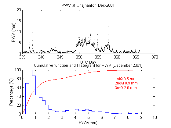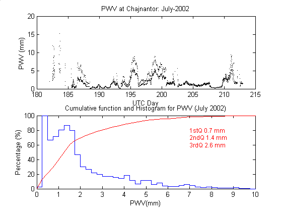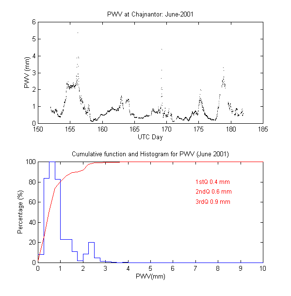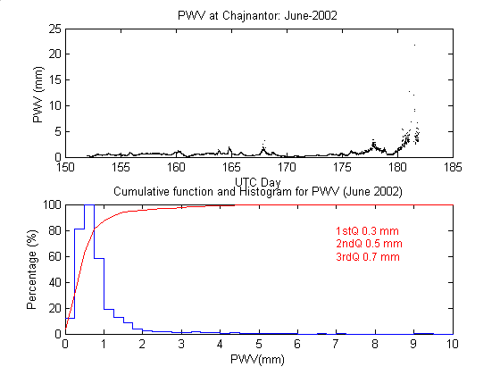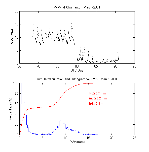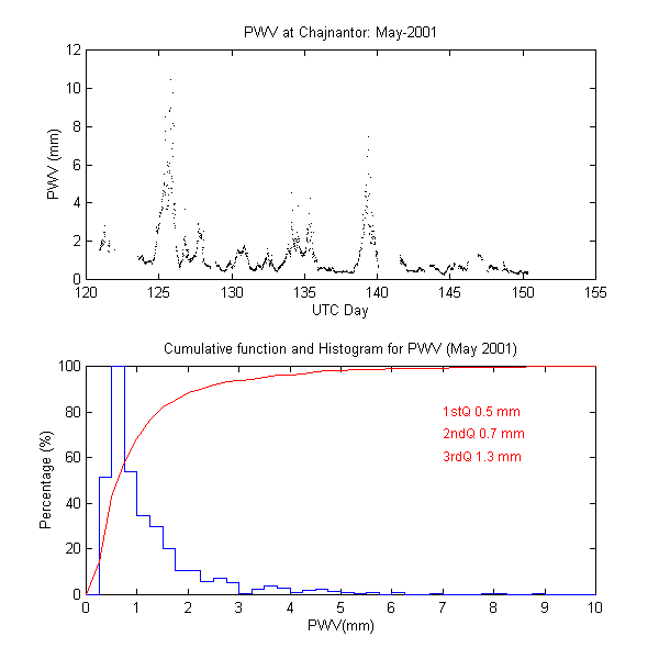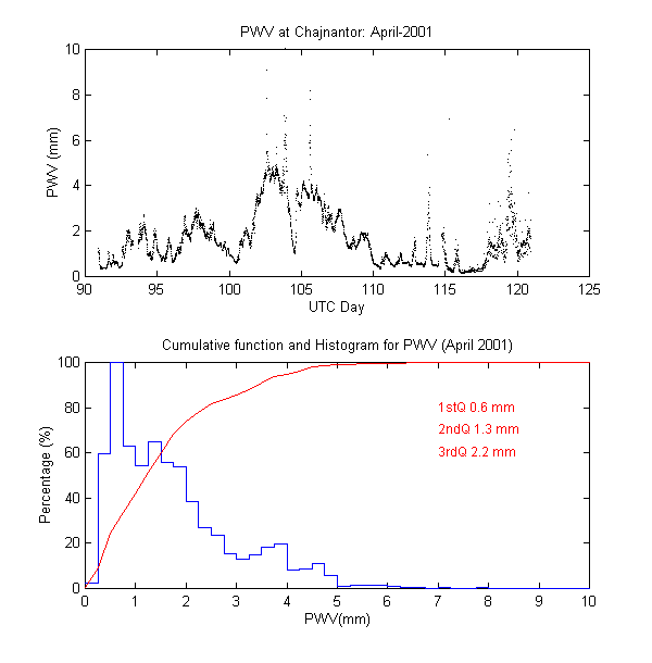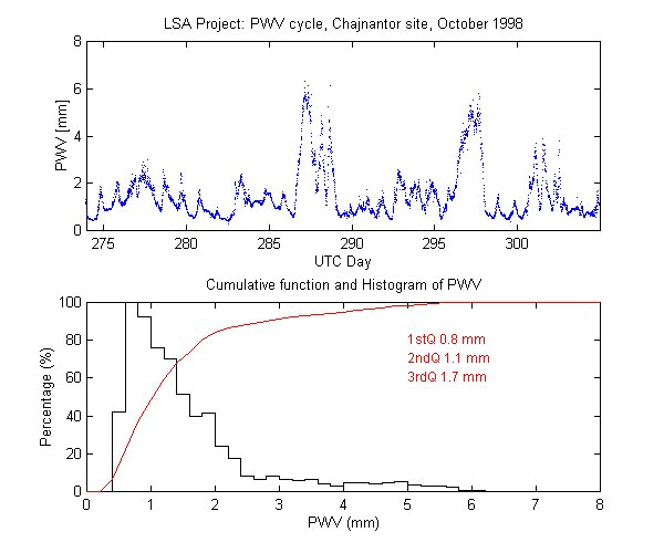 To measure the precipitable water vapour, Onsala Space Observatory and the The Cavendish Astrophysics Group at the University of Cambridge had designed and built two 183 GHz radiometers . These radiometers measure the brightness temperature in three bands close to the 183 GHz water line. These bands are: 1.2 GHz, 4.1 GHz and 7.6 GHz away from the water line centre. During data reduction we iterate on the water vapour density in the radiative transfer equation to obtain the amount of precipitable water vapour producing the sky brightness temperature measured by the 183 GHz radiometer.